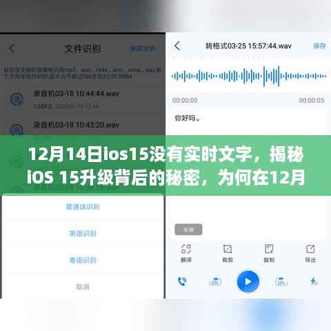 摘要:关于iOS 15升级背后的秘密被揭示。在12月14日的升级中,实时文字功能未能如期实现。据分析,可能是由于技术限制或开发过程中的问题导致该功能未能如期完成。目前,具体原因尚不得而知,但用户对此表示关注和期待。